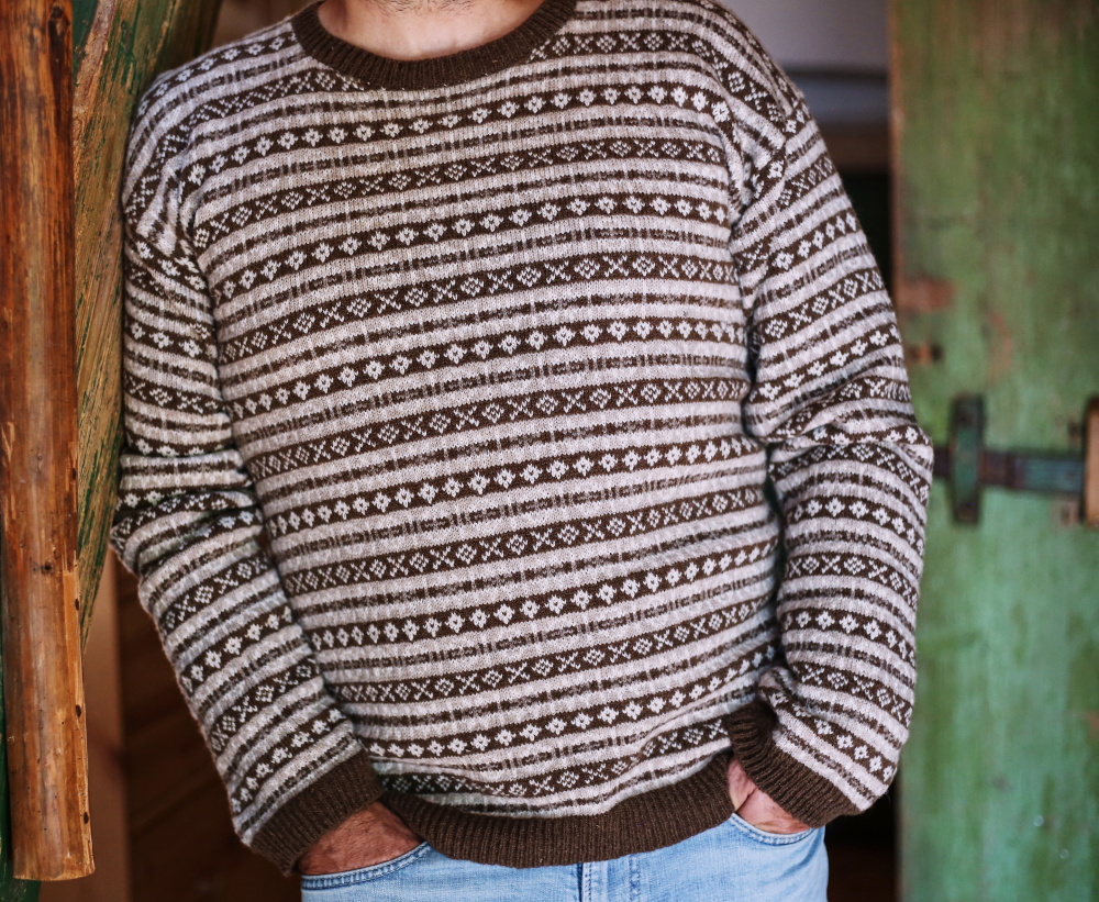 Pánský svetr pletený technikou Fair Isle z vlastní eko shetlandské vlny.