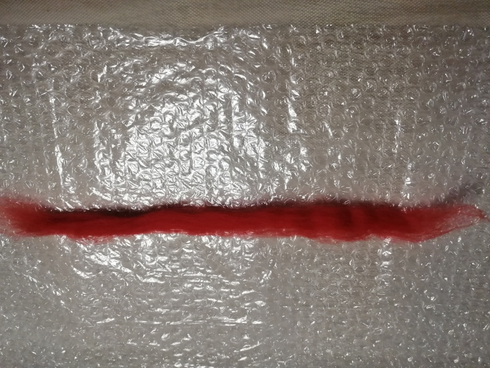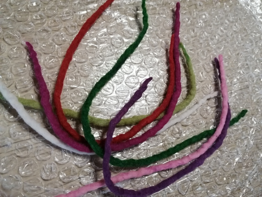 Potřebovat budeme obyčejnou gumičku do vlasů, několik různobarevných pramenů – česanců vlny, trochu teplé vody s detergentem (mýdlo, jar, šampon), neklouzavou podložku – nejlépe kus bublinkové fólie, co jsme vybalili z poslední zásilky e-shopu, no a chuť do tvoření. Protože žádných zvláštních natož speciálních dovedností netřeba.