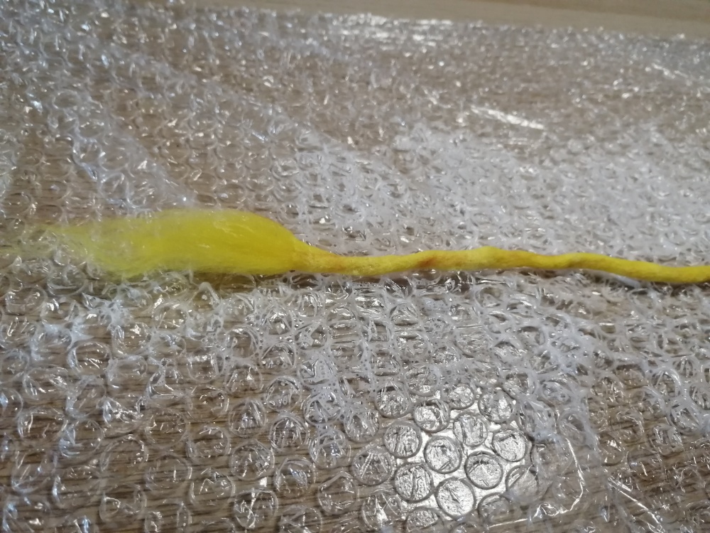 Z česance ušouláme nudličku. Šouláme dlouze a pečlivě po celé délce. Je dobré občas domydlit, aby to hezky pěnilo, lépe se vlna plstí. Rukama válíme a směřujeme pohyb po ploše a spíše k sobě navzájem, aby se jednotlivá vlákna lépe do sebe zasekla. Nejlépe tak, aby nám z toho vyšla pěkná žížala – bez „opasku“ či „hladových“ částí. Uchopíme česanec další barvy, zpracujeme, a pak další a další… máme zde několik pečlivě vyválených žížaliček.
