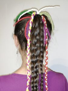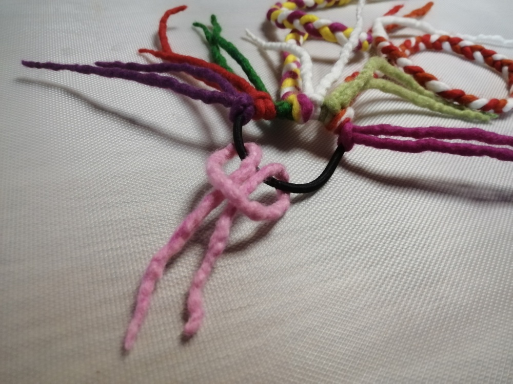 Tři takto vyválené hadičky spleteme do copánku. Nejdelší užovkou zavážeme konec, mírně utáhneme. Všechny výrobky naskládáme do hrnečku či jiné nádobky a zalijeme horkou vodou. Trochu promícháme např. lžičkou. Propláchneme studenou vodou, čímž se nejen stabilizuje plstění, ale také vypláchnou poslední zbytky šamponu či mýdla. Pak už jen vysušíme v ručníku. Necháme doschnout. Jednotlivé ruličky – dredy navážeme na gumičku dle fotografie. Aplikujeme na jednu polovinu gumičky, aby se dala lehce zatočit do vlasů.