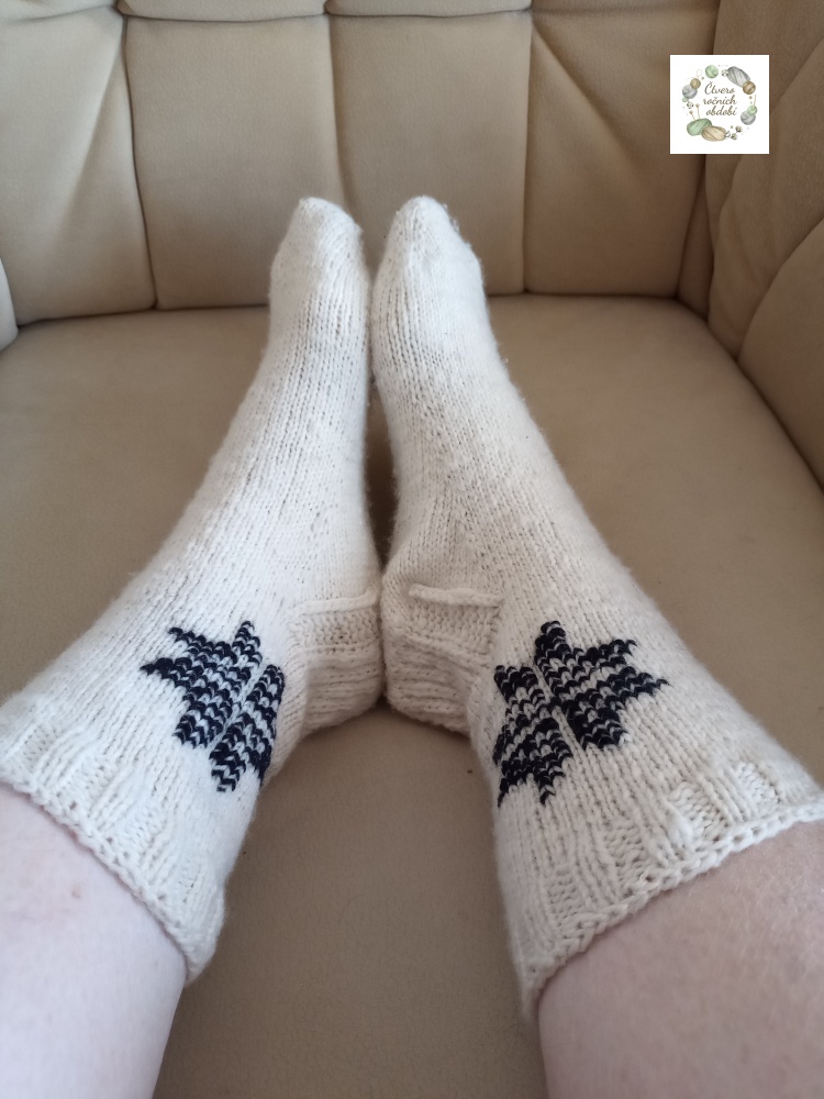Ponožky s motivem vločky – zakoupený česanec merino z Ateliéru Johanna, upředeno na kolovrátku, upletené ponožky na kruhové jehlici od špičky (obě najednou) a vyšitý motiv vločky z upředeného černého merina.