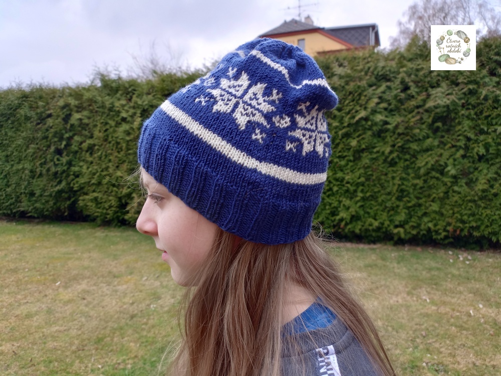 Čepice s motivem vločky – pleteno z komerční příze Drops Baby Merino, pleteno na 4 jehlicích, vločky vyplétané, foceno se svolením vnučky 🙂