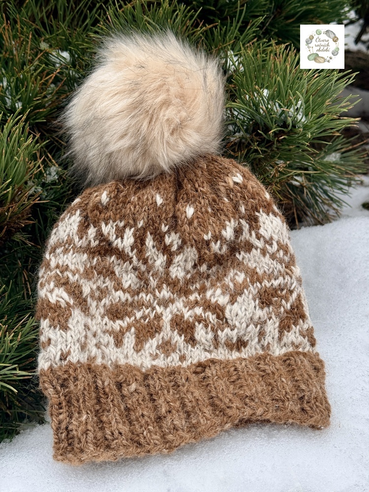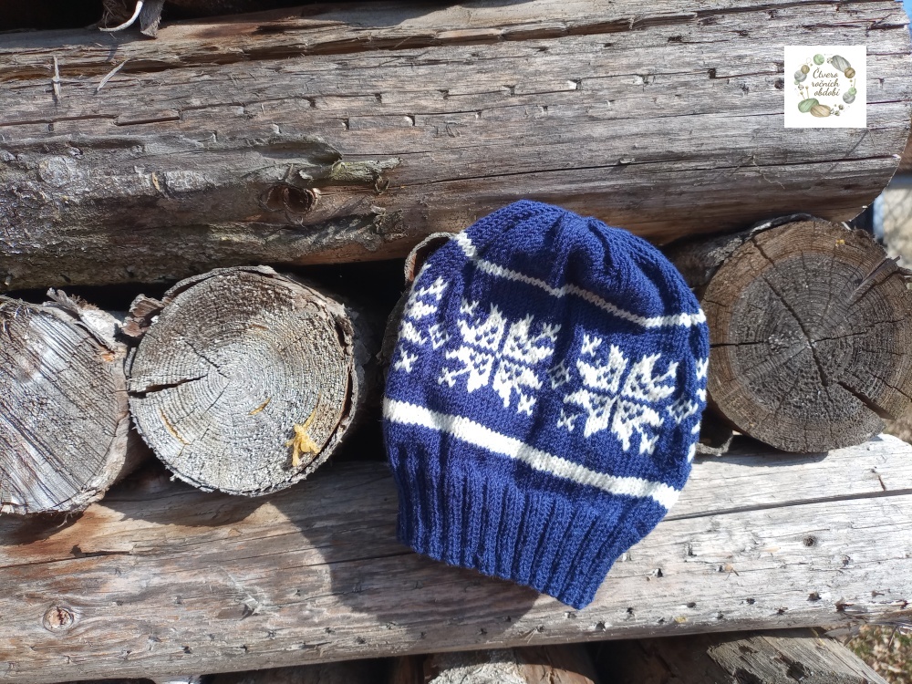 Čepici jsem upletla na kruhové jehlici, bezešvou s ohrnovacím lemem a sněhové vločky na ní jsou tentokrát drobnější, vyšívané.