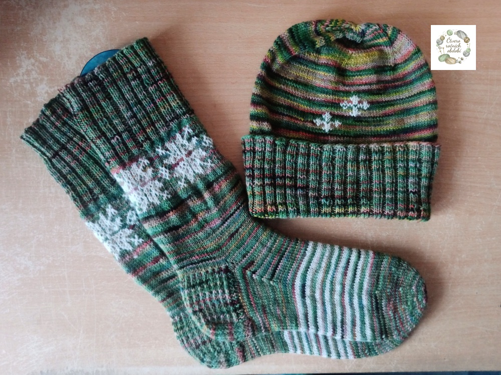 Upletla jsem set ponožek a čepice s názvem První sníh v podzimním lese. Materiál je ponožková příze od Jadoli (složení 80 procent merino, 20 procent kukuřičné vlákno).