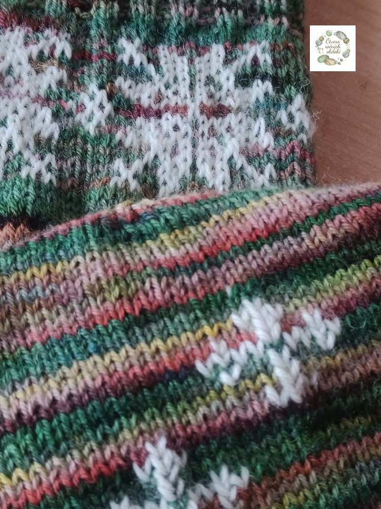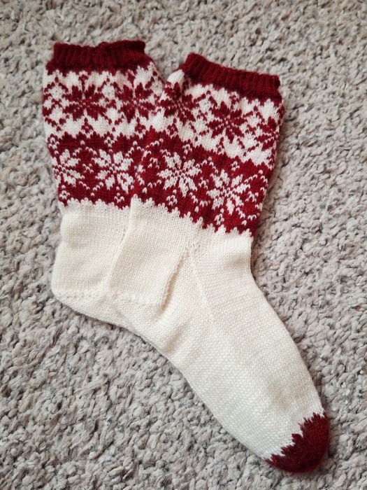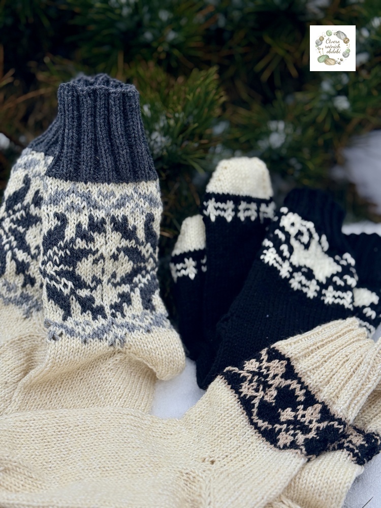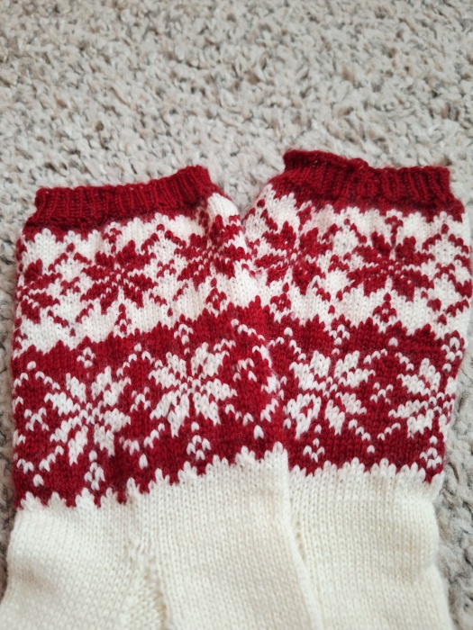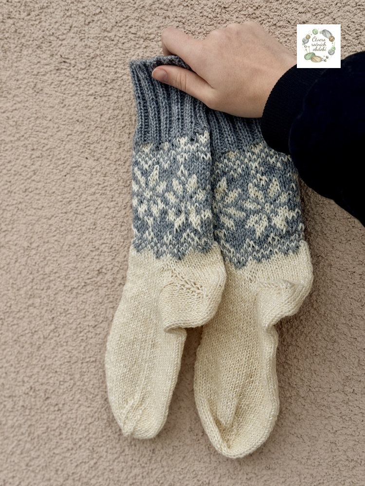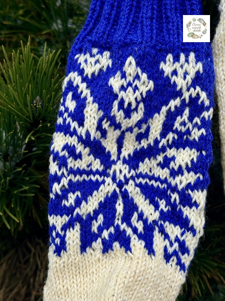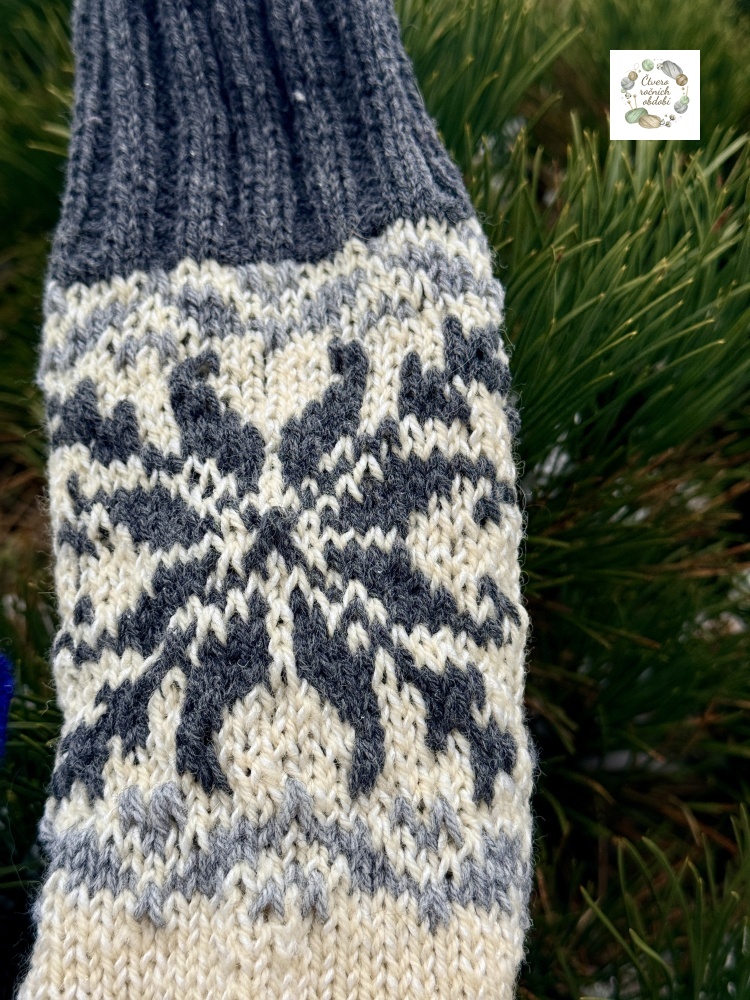 Ponožky jsou vyšší, dají se ale nosit i ohrnuté a pak mají klasickou výšku. Pletla jsem velikost 41, se zesílenou patou a klínkem pro pohodlné oblékání, špička je hvězdicová. Sněhové vločky jsou vyplétané (posílám i fotku výpletu z rubu). Pletla jsem na pěti jehlicích.