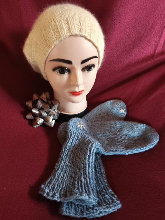 Přikládám fotografe ponožek z ponožkové příze (Babiččina ponožková) a jedny jsou tam v pozadí mimo soutěž, ale tematicky se hodí (s beránkem). A čepici z mnou ručně zpracované příze alpaky, která je prostě ňuňánková.