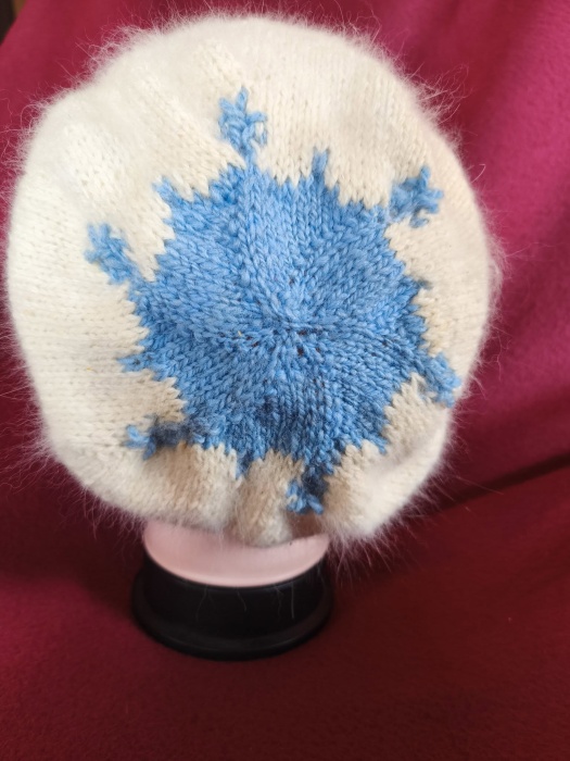 No jo!! Jenže konec března se blíží a já nemám ještě tu čepici. A tak zase usedám s jehlicemi, říkám si: „Jano, buď v klidu, plést umíš, to ti půjde.“ Hm…ale vyšívat tu vločku už tam nechci a taky bych chtěla spojit nádhernou přízi merina s angorou a tu modrou od ponožek. Jo, jenže jak to vymyslet, aby tam ten zbyteček modré vyšel na celou vločku? Tož… co bych se s tím cárala nějak složitě, začnu od té vločky a kam až vyjde, tam bude. Hotovo. Plán je jasný. A ono to jde! Začínám od konce čepice na 6 ok (protože vločka je přece šesticípá), postupně rozšiřuji až je to tak akorát (což tvoří 126 ok) a pletu si hezky u pohádky stále jen hladce a hladce dokolečka. Až jsem tam, kde jsem chtěla být (s tou čepicí pochopitelně), spletu každé 4. a 5. oko dohromady. Pak už jen patent 2/2 a čepička shledává, že na světě je docela hezky a někdo už se určitě na ni těší. A protože mi zbyl ještě malý kousek modré příze, došiju konečky vločky, ať je hezky „namrzlá“. A to je všechno, vážení. Jsem na sebe tak hezky pyšná, čepičku vyperu (jako ostatně každý svůj výrobek) a už se těším, až to hezky nafotím a pošlu organizátorce.